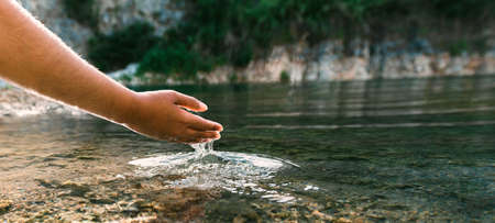 Hand touching clean water surface, creating ripples in a transparent mountain river, concept of nature and purity