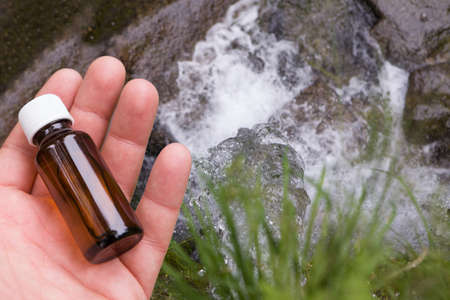 Medicine bottle on the water source background. A glass bottle with herbal extract in your hand.