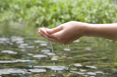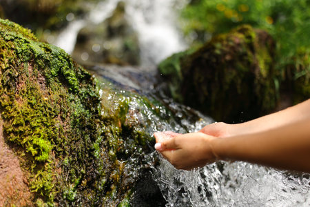 Hands of woman holding a water stream in nature, closeup