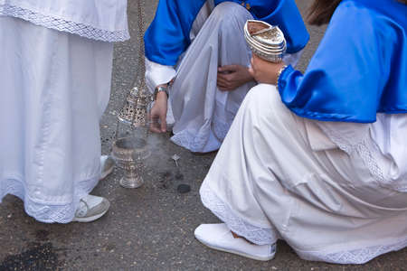 Several altar boys burn incense in a procession of Easter, Andalusia, Spain