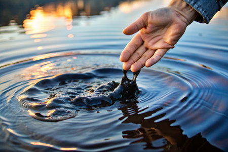 A serene moment captured as a hand reaches into calm water, creating gentle ripples. Ideal for themes of tranquility, nature, and connection.