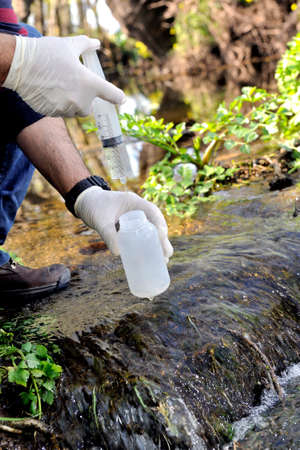 Biologist that collects samples in a water course for the analysis of its pollution and for the study of its characteristics.