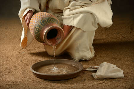 Jesus pouring water from jar into pan over dark background