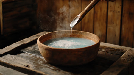 A serene close-up image showcasing a rustic wooden bowl containing a vibrant blue liquid, with steam rising gently. A rustic wooden spoon stirs the mixture, inviting a sense of traditional culinary practice.