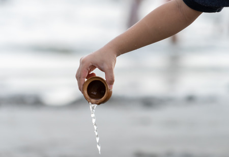 Child hand pouring water on to the Beach sea
