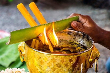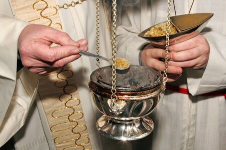 a piece of incense or of wax in a tea spoon of silver in the hands of a priest. Christian tradition.