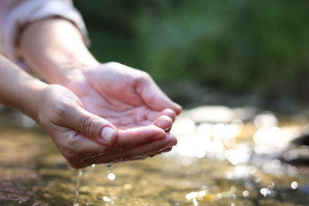 Hands gently holding crystal-clear water in a sunlit stream, reflecting golden light and symbolizing purity, nature.