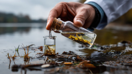 A researcher carefully collects water samples from a serene natural water body, highlighting the importance of ecological studies and environmental preservation.