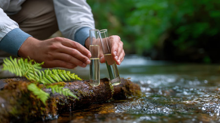 A person is carefully comparing water samples in test tubes by a flowing stream, showcasing a hands-on approach to environmental research and water quality assessment.