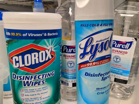 Kirkland, WA / USA - circa March 2020: Stockpile of Clorox wipes, Lysol spray, and Purell hand sanitizer in preparation for a COVID-19 coronavirus quarantine.