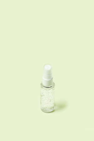 Medical hand sanitizer on a pink background with bottle cap, copy space. Spray for disinfection in the case of a coronavirus pandemic