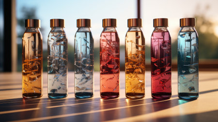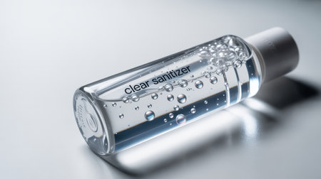 A small, clear hand sanitizer bottle with label and bubbles, lying on a reflective white surface. AI generated.
