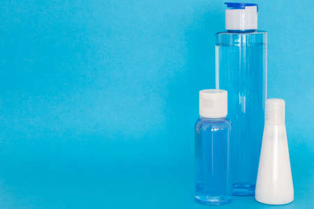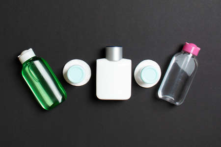 Top view of means for face care: bottles and jars of tonic, micellar cleansing water, cream, cotton pads on colored background. Bodycare concept with empty cpace for your ideas.