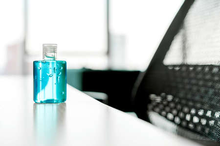 Clear alcohol gel in bottle for use in hand washing placed on the office table, prevent germs protect virus Covid-19, health care in office, meeting room or public space. Medical health protection.