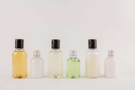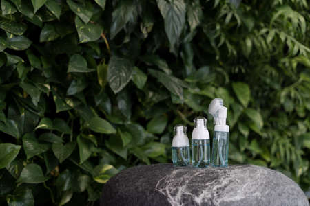 Plastic bottles and transparent containers with natural beauty products standing on stone. Organic and eco friendly cosmetic against copy space background. Skin care concept