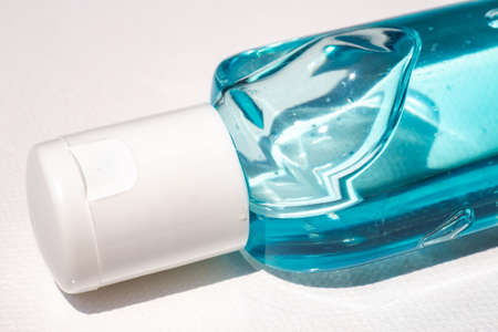 Picture with one bottle of hand sanitizer with antimicrobial transparent gel with bubbles for disinfection hands.