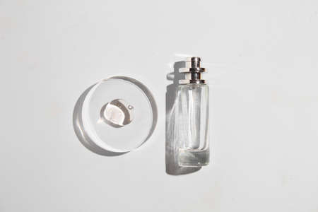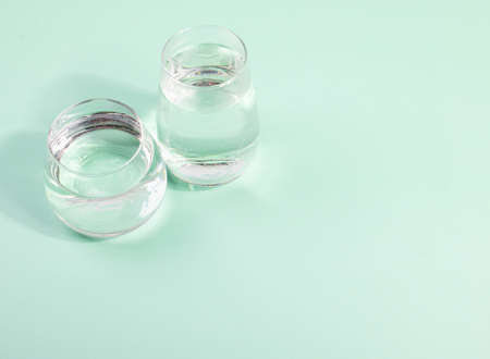 A jar of cosmetics, eco-friendly cosmetics. Transparent glass bottle of cosmetic perfume on a blue background.