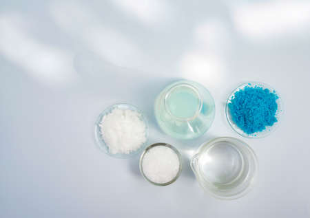 Potassium chloride and Copper(II) sulfate in chemical watch glass place next to Microcrystalline wax in glass container, alcohol in beaker and Erlenmeyer flask.