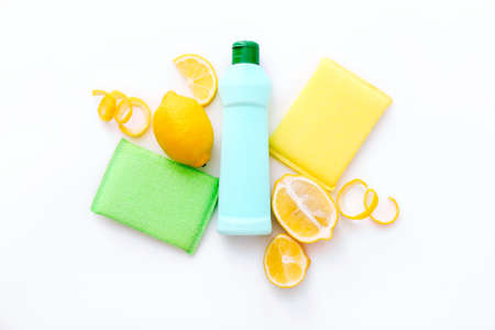 Plastic bottle of dishwashing liquid and lemons on white background. Washing and cleaning concept.
