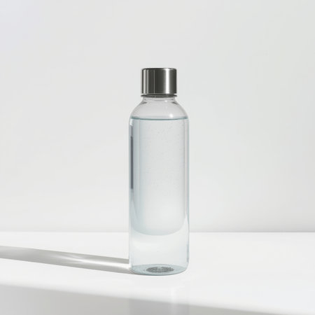 This clear reusable water bottle sits on a light surface, filled with fresh water. It reflects bright light, emphasizing its sleek design and practicality for daily hydration.