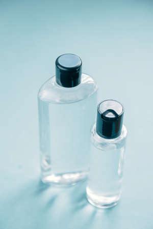Hand sanitizer transparent bottle with spray cap at the middle of blue background. Simple flat lay with pastel paper texture. Medical concept. Stock photography.