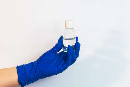 A hand in a blue latex glove holds a disinfectant. The concept of preventive protection against coronavirus. Use of antiseptics for cleaning.