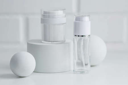 Glass white bottles on the podium for oil, lotion, cream on the background of a brick wall. natural cosmetics. Layout of the beauty salon branding.