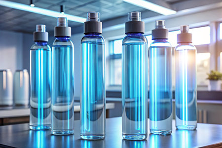 Plastic bottles with clear liquid on table in laboratory, closeup