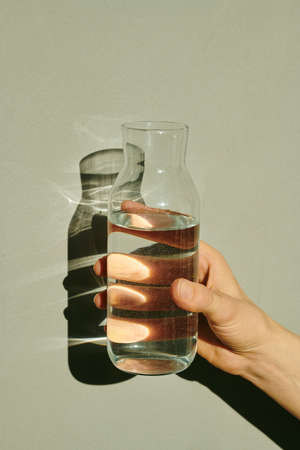 Elegant still life image featuring a clear glass jar filled with water, placed on a wooden surface and softly illuminated by natural sunlight. The light streams through a nearby window, casting gentle shadows and reflections across the table, while small air bubbles inside the jar add texture and visual interest.