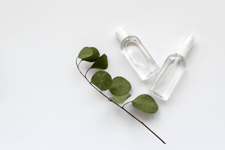Bottles of antiseptic hand gel and spray decorated leaves on white background. Flu, illness, pandemic concept