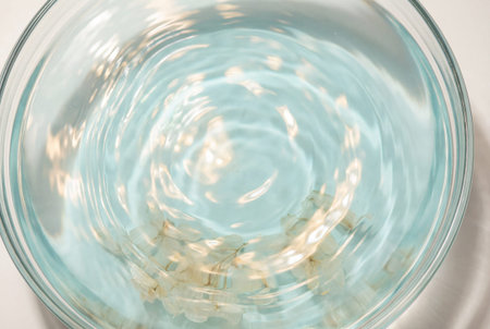 Serene aqua cosmetic floral water fills a clear glass vessel with gentle concentric ripples forming on the surface in this calm and translucent display