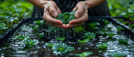 Close-up image features human hands cupping clear, flowing water with a sprig of green leaves. Water runs through fingers; light shining. Symbolizes life, purity, nature's renewal.