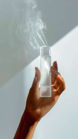 A Hand Holds A Frosted Glass Bottle Of Spray In Sunlight.