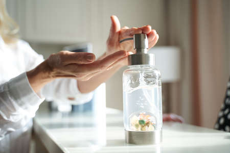 Woman applying antibacterial sanitizer gel for hand. Coronavirus Disease (Covid-19) prevention and health protection during flu virus outbreak concept.