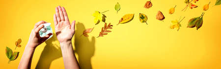 Applying sanitizer gel with autumn leaves - healthcare and hygiene concept