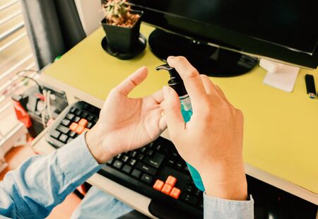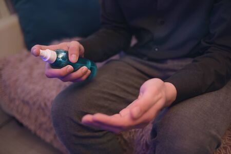 Sars-CoV-2 and Covid-19 infection gel spray. Man hand-washing spray.
