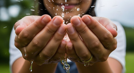 Tranquil hands cradling clear water, reflecting nature s purity and serenity under sunlight