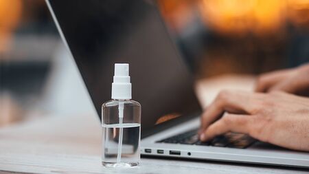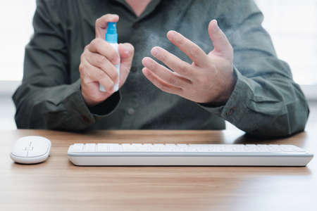 Close up hand a man use alcohol bottle spray clean hand and keyboard mouse desktop on the table primary disease prevention in home concept