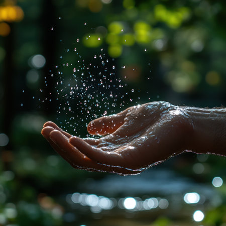 Water droplets shimmer in sunlight, falling gracefully from an open hand.