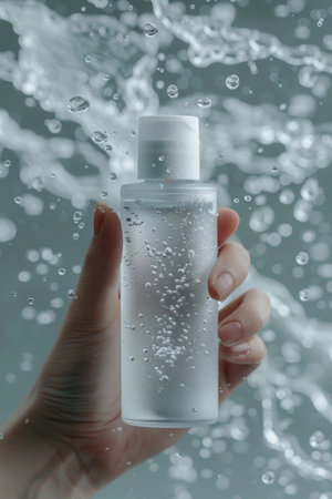 Skincare dropper bottle showcased in a well groomed hand with polished nails on water backdrop