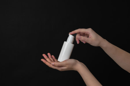 Human hand spraying sanitizer over black background