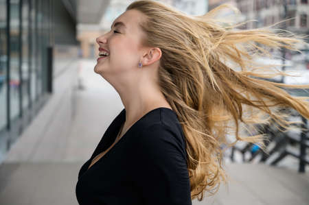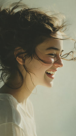A half-body side portrait of a young woman with hair blown by wind, laughing playfully, realistic details, bright soft tones