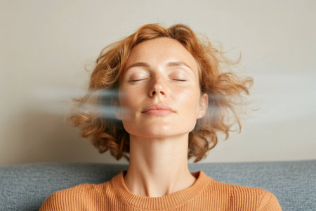 Woman with flowing hair enjoys sunlight, her face illuminated with warm glow. soft breeze adds sense of freedom and joy to moment, capturing serene expression