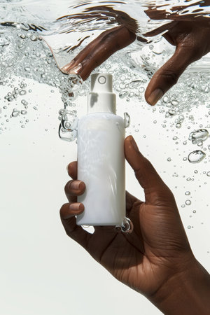 Hand Holding White Cosmetic Bottle, Minimalist Skin Care Routine Concept with Water Splash