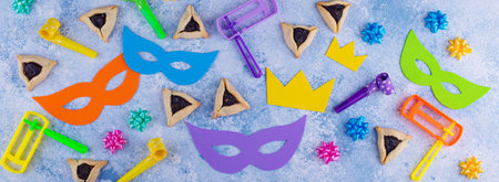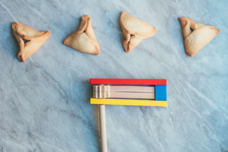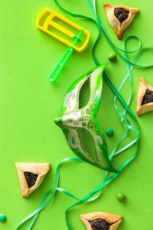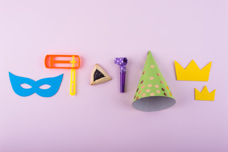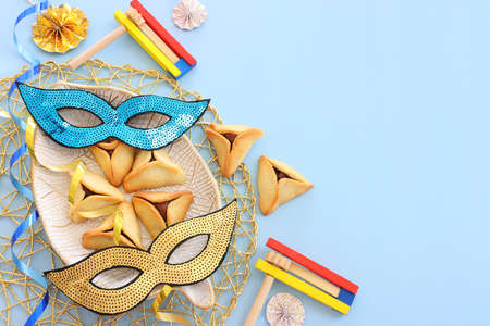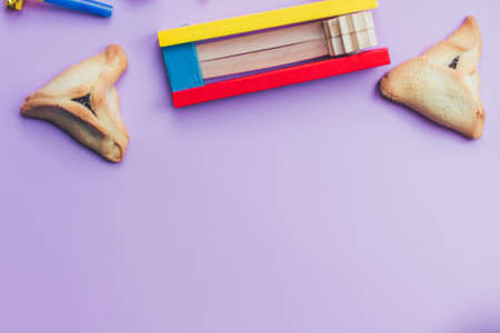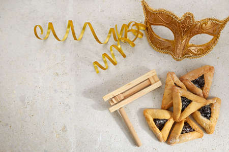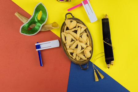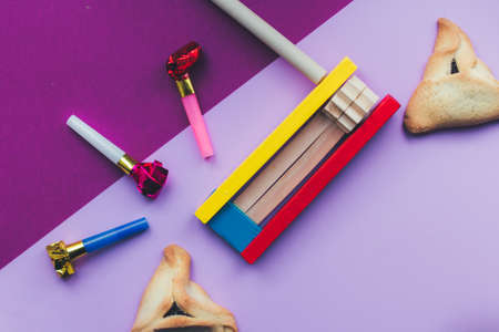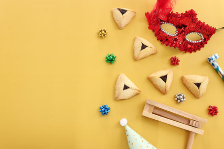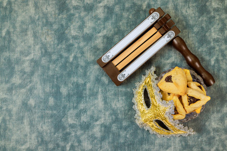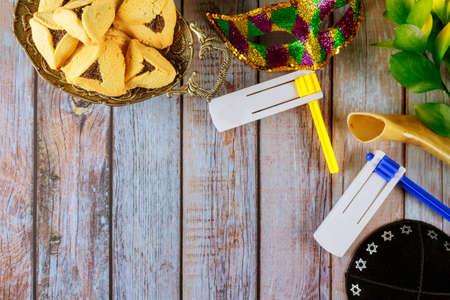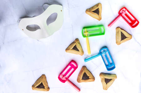 Top view from above Jewish carnival Purim celebration on hamantaschen kosher cookies carnival noisemaker and mask