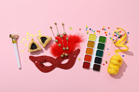 Purim celebration concept (Jewish carnival holiday) over pink wooden background. Top view