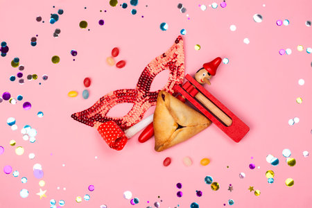 Purim celebration jewish carnival holiday concept. Tasty hamantaschen cookies, red carnival mask, noisemaker, sweet candies and party decor on pink background. Top view, flat lay, copy space.