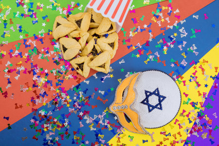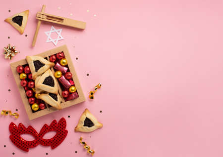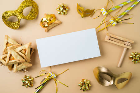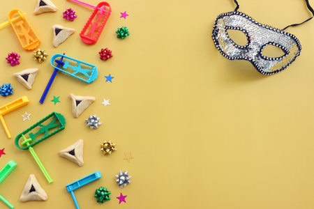 Purim celebration concept. Jewish carnival background. Top view. Flat lay