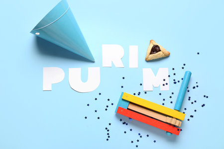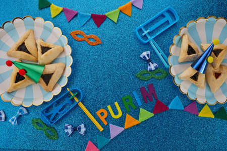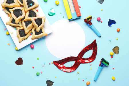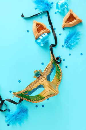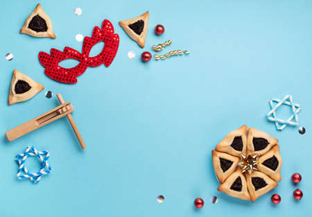 Purim celebration concept (jewish carnival holiday) over blue background. Top view, flat lay