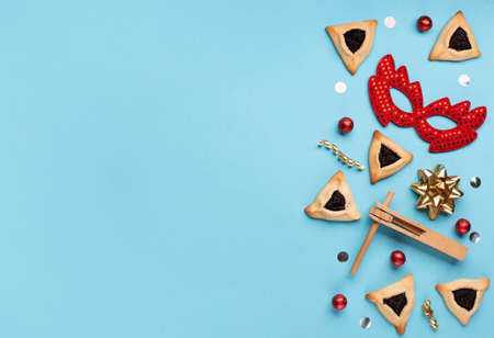 Purim celebration jewish carnival holiday concept. Tasty hamantaschen cookies, red carnival mask, noisemaker, sweet candies and party decor on blue background. Top view, flat lay, copy space.